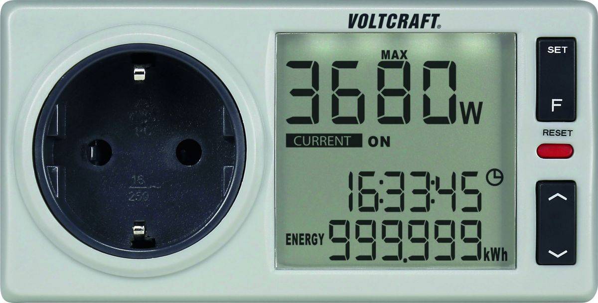Технические характеристики: Напряжение: 230В (переменное) Частота: 50Гц Разброс напряжений: 230В — 250В Рабочий ток: <16А Диапазон отображаемого времени: 0 сек — 9999 дней Диапазон отображаемой мощности (Ватт): 0Вт — 9999Вт Диапазон отображаемого тока потребления (Ампер): 0.000А — 16.000А Диапазон отображаемой частоты: 0Гц — 9999Гц Диапазон отображаемой минимальной мощности: 0.0Вт — 9999Вт Диапазон отображаемой максимальной мощности: 0.0Вт — 9999Вт Диапазон отображаемой стоимости электроэнергии: 0.00€/кВт — 99.99€/кВт Диапазон отображаемой потребленной мощности и денежные затраты: 0.000кВт — 9999кВт, 0.00€ — 9999€