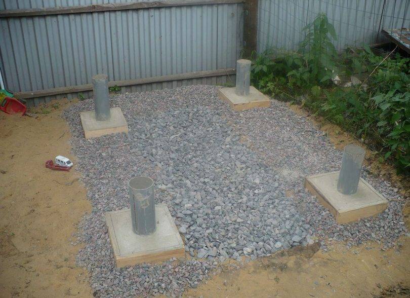 - После того как каркас собран, копается яма необходимого размера. Вынимается верхний слой почвы глубиной 10-15 см, разравнивается и заливается бетонная стяжка. Как только стяжку залили и выровняли, необходимо установить сверху собранный каркас таким образом, чтобы стойки, которые изначально были длиннее, погрузились в бетон. Уровнем проверяется вертикальность установленной конструкции и корректируется при необходимости. Если длина ножек превысила высоту бетонной стяжки, необходимо забить их в землю до полного погружения.