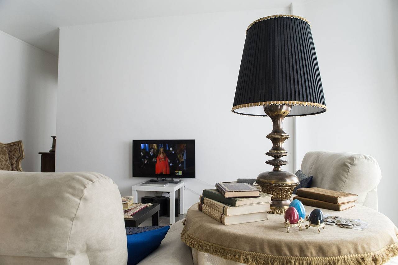 Рядом с диваном ставим торшер на изящной длинной ножке. Если розетка в комнате только одна, придется использовать удлинитель.