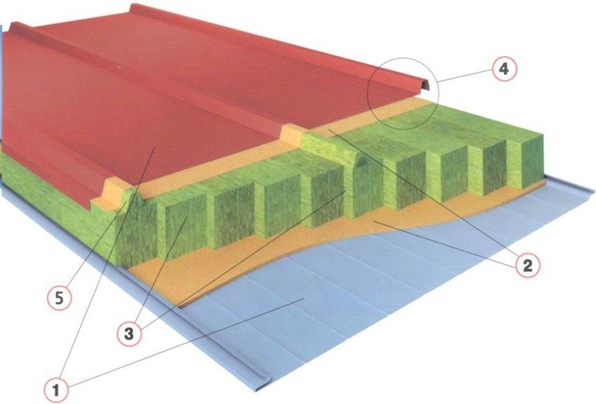 Конструкция кровельной сэндвич-панели: 1 — оцинкованная сталь с полимерным покрытием, 2 — двухкомпонентный клей на полиуретановой основе, 3 — конструкционные ламели минеральной ваты на основе базальтового волокна, 4 — лабиринтное замковое соединение, 5 — трапециевидная ламель из минеральной ваты на основе базальтового волокна