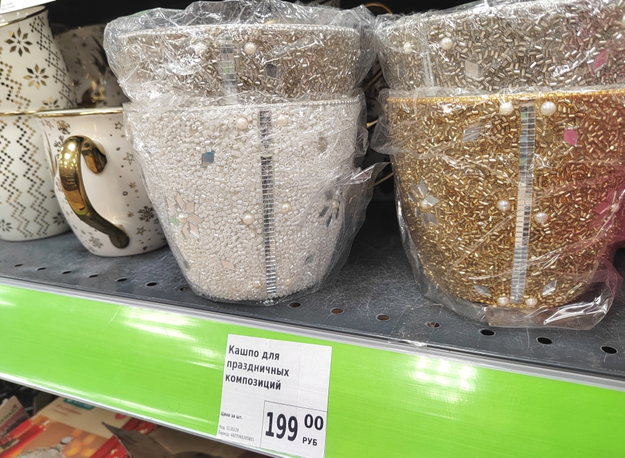 Из самого красивого отмечу горшки с камушками и стеклярусом. Я купила такой серебряный, с декабря он служит мне подставкой под мандарины.