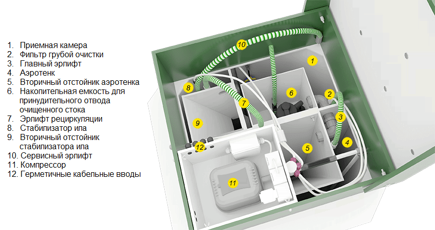 Саморегулирующий аппарат вертикального типа быстро перерабатывает нечистоты. В приемнике на стоки воздействуют аэробные бактерии. Вентилятор подает кислород, увеличивая скорость расщепления на воду и осадок. Эрлифт перемещает жидкость в сегмент с анаэробами, где происходит осветление и выход чистого остатка.