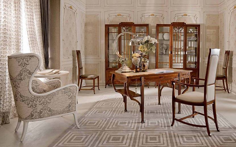 Помещение, как правило, оформляется в светлых тонах, на таком фоне прекрасно смотрится меблировка темного цвета. Предметы мебели отличаются простотой и изяществом. Интерьер с такой обстановкой выглядит благородно.