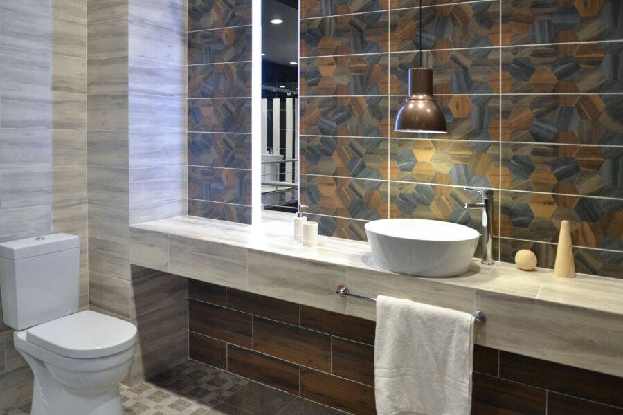 - Для ванной комнаты. Керамика для ванной должна быть влагостойкой и максимальной защитой от химических реагентов. Для маленькой комнаты не стоит брать широкоформатные варианты, так как установка их с учетом большого количества труб в ванной будет трудоемкой.