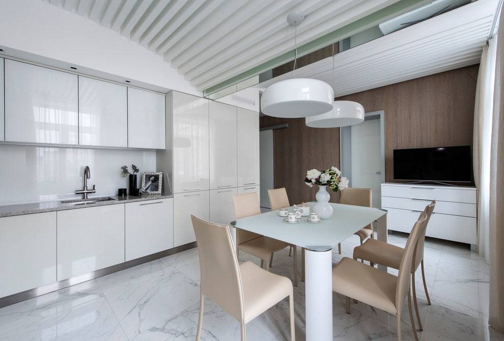 Имитация под белый мрамор значительно сэкономит бюджет, при этом в интерьере будет смотреться дорого и стильно. Из недостатков можно отметить хрупкость и низкую звукоизоляцию. Так же при ремонте желательно установить теплые полы, так как материал плитки холодный.