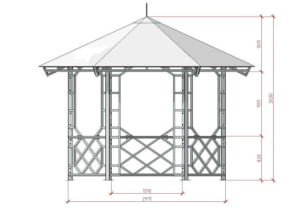 Чтобы сделать шестигранную беседку необходимо точно знать, из каких элементов она будет состоять. Поэтому следует выделить основные части конструкции: