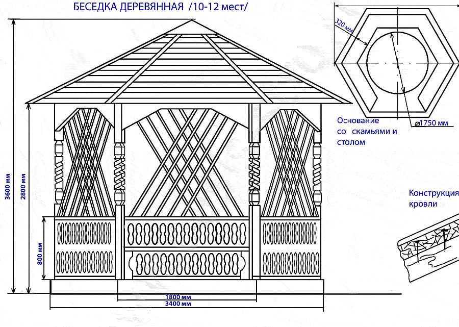 Прежде, чем сделать шестигранную беседку своими руками, необходимо подготовить чертеж. На нем указываются габаритные размеры конструкции и способы стыковки элементов каркаса: рамы пола к фундаменту и стойкам, а также крепление стоек к крыше.