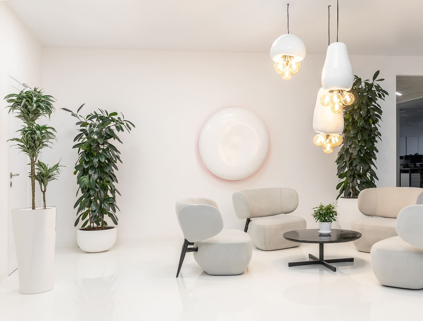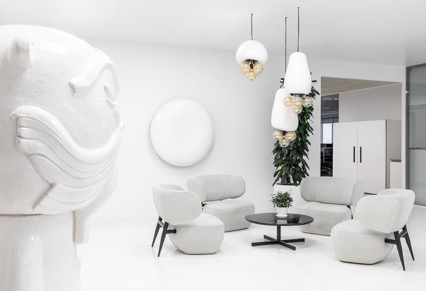Не забудьте об ярких пятнах в виде диванных подушек, контрастных штор или оригинального журнального столика. Разбавить унылый белый цвет можно вкраплениями голубого, насыщенного желтого, бирюзового. Это могут быть фото в рамке, картины, напольные вазы или оригинальные статуэтки.