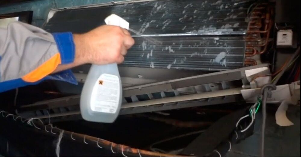 Специальные средства, предназначенные для очистки климатической техники, способны эффективно растворить скопившиеся загрязнения. Через положенное время состав следует аккуратно смыть