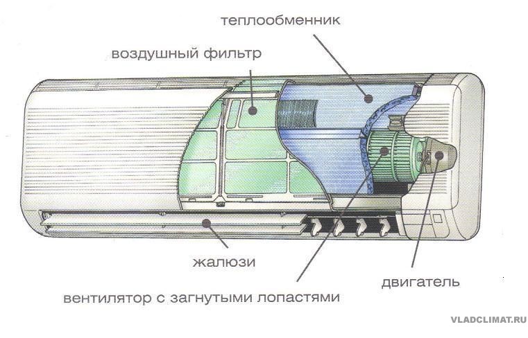 - охлажденные воздушные массы кондиционер подает в помещение;
