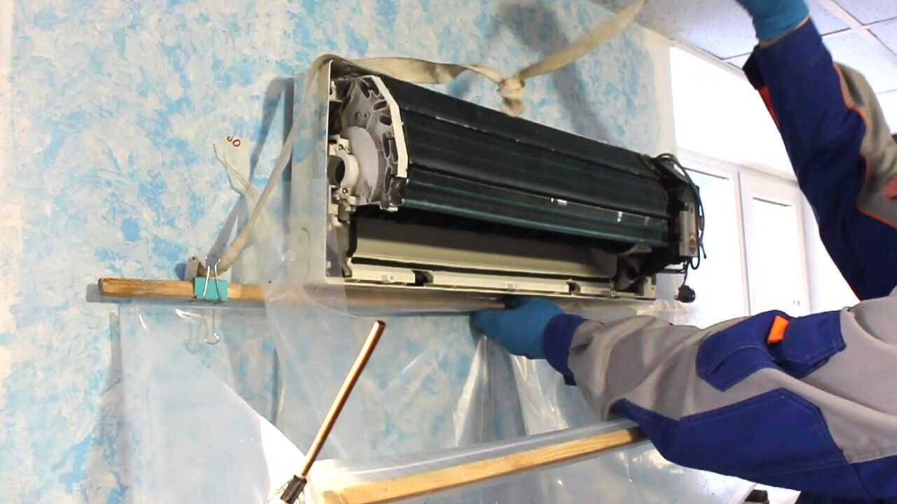 Некоторые умельцы решили отказаться от разборки внутреннего блока. Они снимают только переднюю крышку, фильтр, а затем застилают стену полиэтиленом и промывают внутренний блок тонкой струей воды под большим напором. Это не лучшее решение, поскольку можно и кондиционер так сломать, и повредить декоративную отделку.