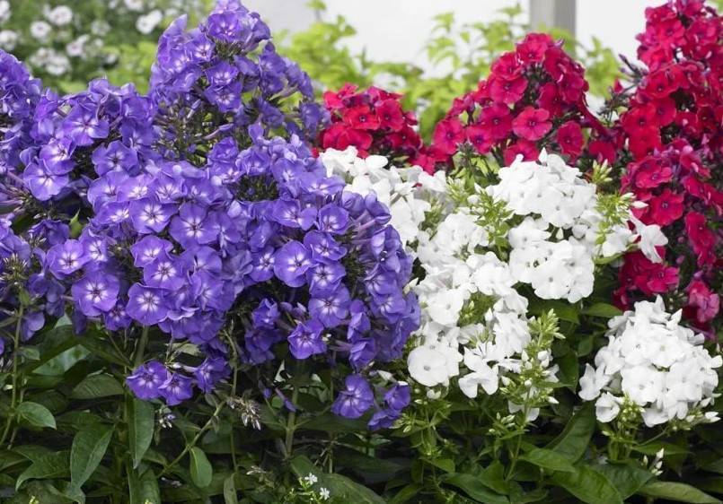 Передний план слева украшают флоксами сине-фиолетового цвета, а справа – розового. Затем окружают их невысокими цветами розового, красного или белого цветов, например, пенстемонами.