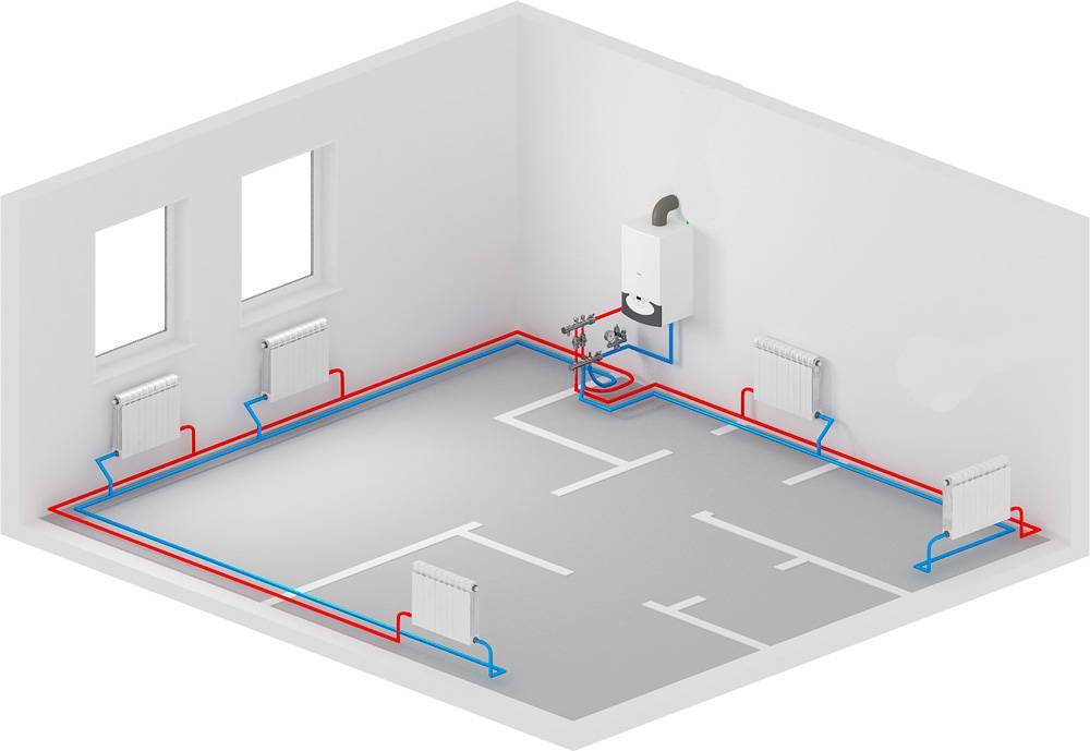 Горячая вода подается по одному трубопроводу, а остывшая – по другому. Таким образом обеспечивается равномерное распределение тепла по всем батареям.