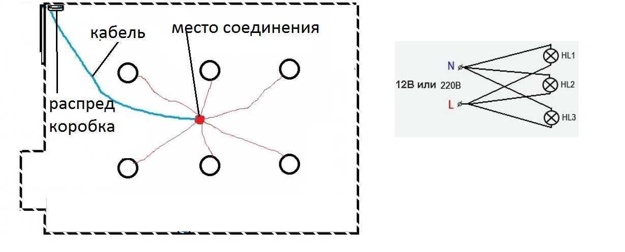 В большинстве случаев используется параллельная схема подключения точечных светильников (ламп). Даже несмотря на то что требуется большое количество проводов. Зато напряжение на все осветительные приборы подается одинаковое, при перегорании не работает одна, все остальные — в работе. Соответственно, никаких проблем с поиском места поломки.