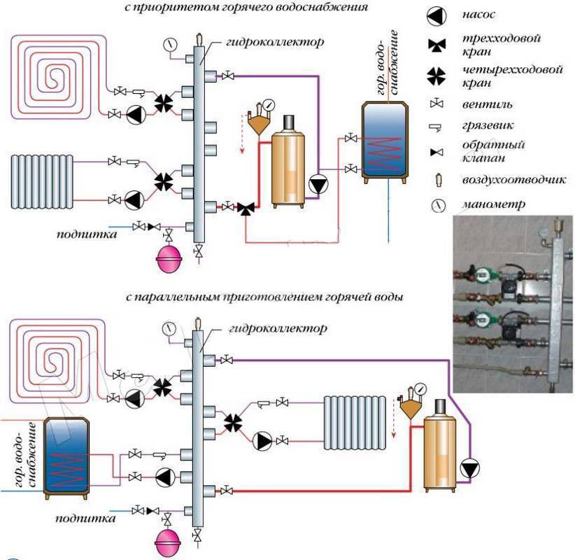 Также этот элемент может включаться в часто изображаемую на разных фото схему с гидрострелкой. Согласно правилам такой вариант востребован для систем с большим количеством контуров. Но чтобы его реализовать, надо выполнить одно требование: провести установку группы безопасности и циркуляционного насоса на контур с бойлером. Некоторые схемы предусматривают последовательное подключение бойлера.