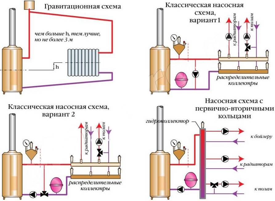 Параллельное подключение используется для подключения газовых и твердотопливных котлов с объемом более 50 литров. Такой выбор обоснован, прежде всего, экономией теплоносителя и снижением нагрузки на систему.