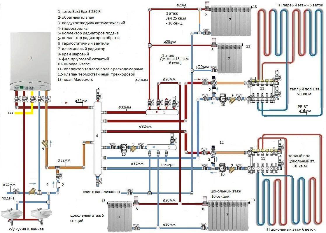 Выбор параллельного или последовательного подключения, создание технических схем позволяют тщательно продумать все нюансы установки оборудования и дополнительных элементов, длину и количество труб, их прокладку и места для штробления стены.