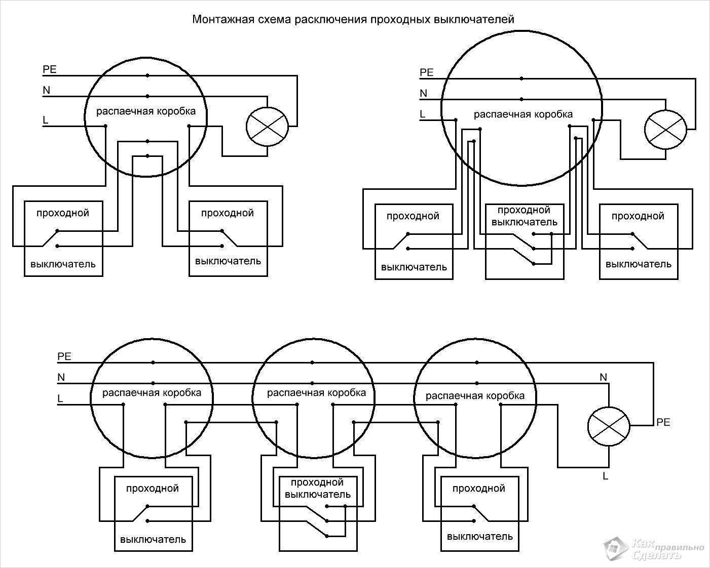 При современном электромонтаже более часто стали применяться проходные переключатели, которые способны выключать или включать, например, освещение в комнате при входе в комнату и одновременно возле кровати или, например, с двух сторон коридора. Для первого случая на монтаж потребуются подрозетники. Также выгодно использовать подобную схему в небольших домах, величиной этажей. Схема электрическая включения лампы из трех мест. Обычный выключатель только замыкает и размыкает цепь Установка двух обыкновенных выключателей в разных местах комнаты не позволит управлять лампой сразу из двух мест.