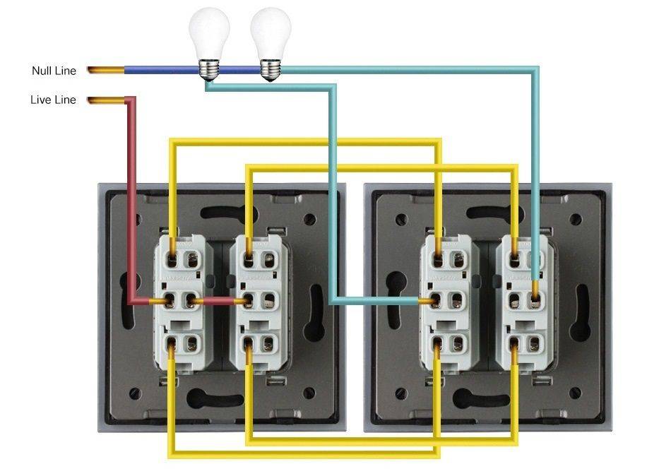 Такой прибор используется для включения света в ванной и туалете или в коридоре и на лестничной площадке, он способен включать лампочки в люстре несколькими группами. Для монтажа проходного выключателя, рассчитанного на две лампочки, понадобится большее количество проводов. К каждому подводится шесть жил, так как в отличие от простого двухклавишного выключателя, проходной не имеет общей клеммы. По существу, это два независимых выключателя в одном корпусе. Схема коммутации выключателя с двумя клавишами выполняется в следующей последовательности: