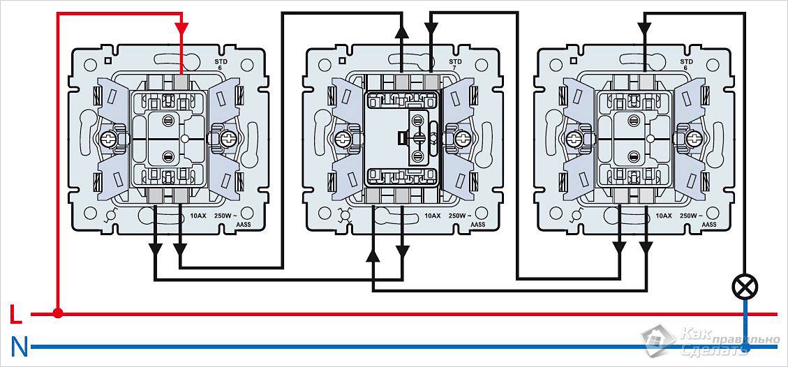 При правильно собранной схеме источник света будет надежно управляться от каждого переключателя. Для этого достаточно поменять положение его любой клавиши.