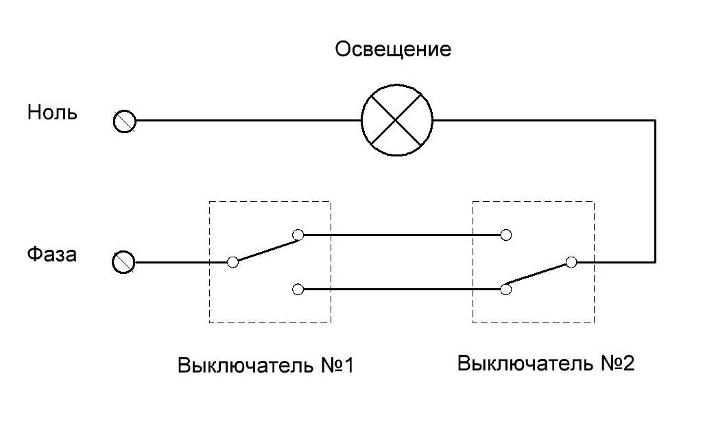 Для включения осветительных приборов из двух мест собирается система из двух проходных одноклавишных выключателей и проводников необходимой длины. К осветительному прибору подводится нулевой провод. А к первому выключателю, на его входной контакт, подводят фазу. Два контакта выхода первого выключателя соединяются с двумя выходами второго выключателя. А от входа второго выключателя тянут фазу к осветительному прибору.