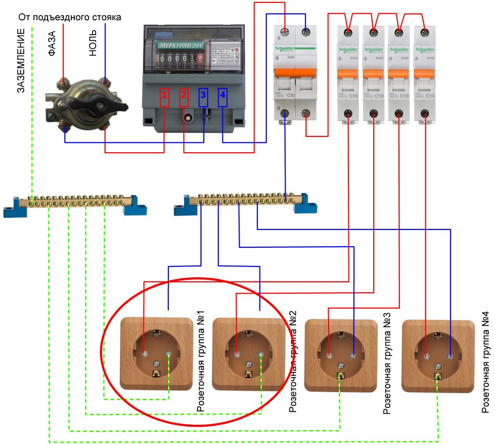 В случае необходимости использовать в квартирной сети потребители с заземлением, используется несколько иная рабочая схема: