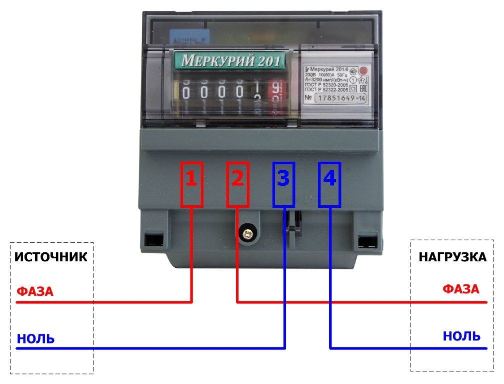 Четыре клеммы счётчика Меркурий однофазной конструкции предназначены: