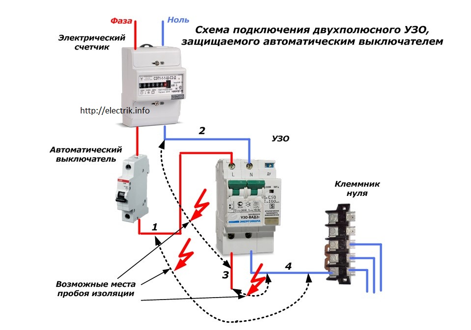 Схема подключения двухполюсного УЗО