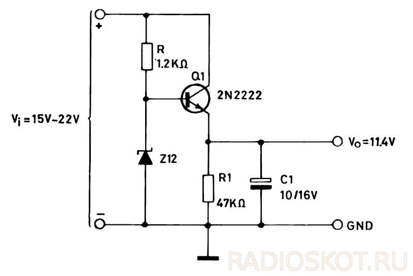 А это показан простейший пример стабилизатора со стабилитроном. Транзистор подключен как повторитель напряжения, а выходное напряжение примерно на 0,7 В ниже напряжения стабилитрона. Резистор R должен быть выбран таким образом, чтобы стабилитрон всегда был правильно смещен, а базовый ток Q1 был достаточным для перевода его в проводящее состояние. Чтобы ток на стабилитроне не упал до значения, не позволяющего проявиться свойствам стабилитрона, маломощный транзистор 2N2222 можно заменить транзистором Дарлингтона.