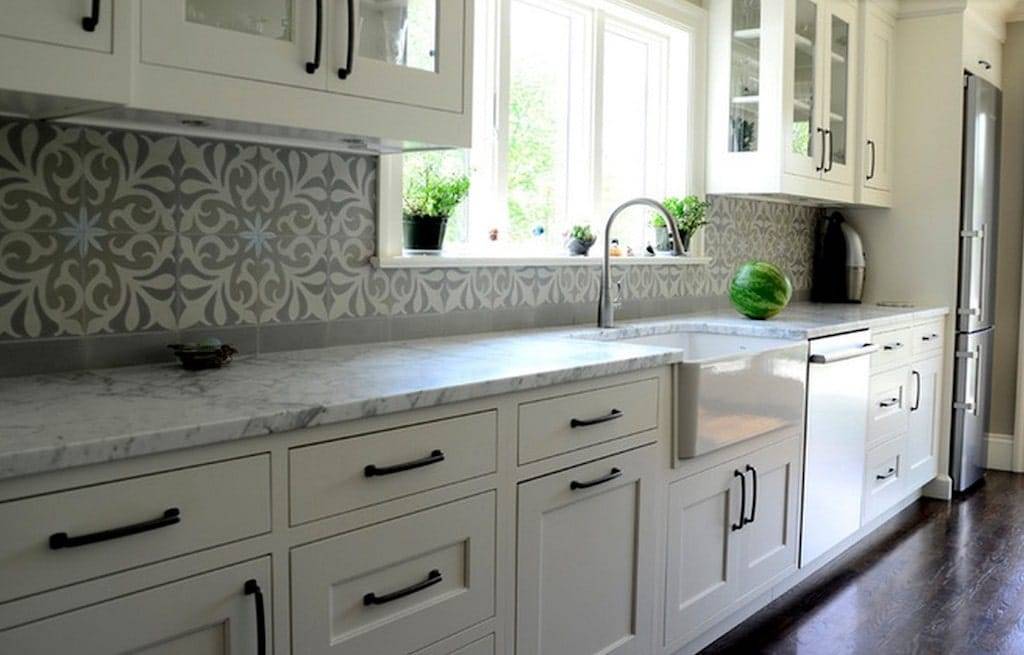 Хотя на самом деле белый цвет моется куда проще, чем принято считать, кухонная рабочая зона все равно будет пачкаться. Эту проблему решает фартук из материала, который можно отчистить обычной губкой с моющим средством. С деревянной белой столешницей сочетается плитка, под камень можно взять такой же искусственный камень тон-в-тон, а акрил дополнит эффектная стеклянная пластина или нержавейка.
