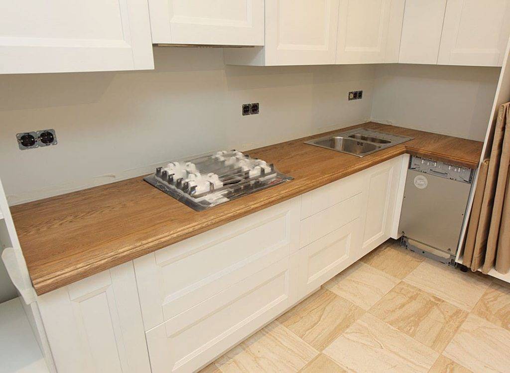 - Натуральное дерево. Гармоничное сочетание с белыми оттенками достигается за счёт природной текстуры. Столешница изготавливается из брусков, склеенных между собой и покрытых специальными пропитками и лаком для защиты древесины. Чаще всего используются дуб, бук, ясень или береза. С помощью лака можно создать эффект состаренного дерева.