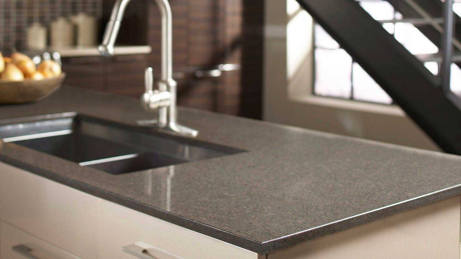 Кварцевый агломерат имеет в составе кварц, связующие вещества (смолы и клей), пигменты. Плиты из этого полимера цельные, толщиной 20-30 мм. Если нужно более 40 мм, используют плиту 20-ку (30-ку) с подложкой. Кварцевая поверхность прочная, устойчива к механическим повреждениям и перепадам температур. Внешне такая поверхность напоминает природный камень.