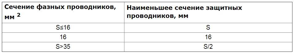 Таблица выбора сечения заземляющих проводников