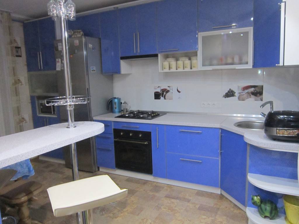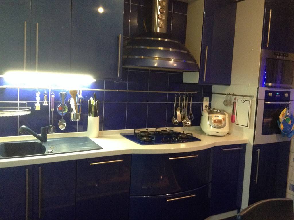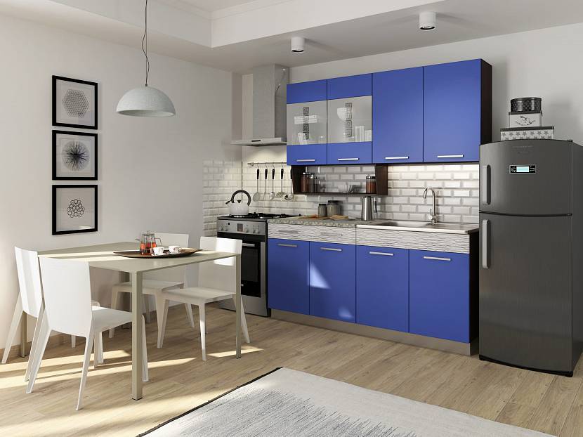 Кухонный гарнитур синего цвета — он может быть изготовлен из дерева, ДСП и МДФ с элементами стекла и пластика. Гарнитуры в подобных холодных тонах больше подходят для обустройства кухонь в современных стилях (минимализм, хай-тек).