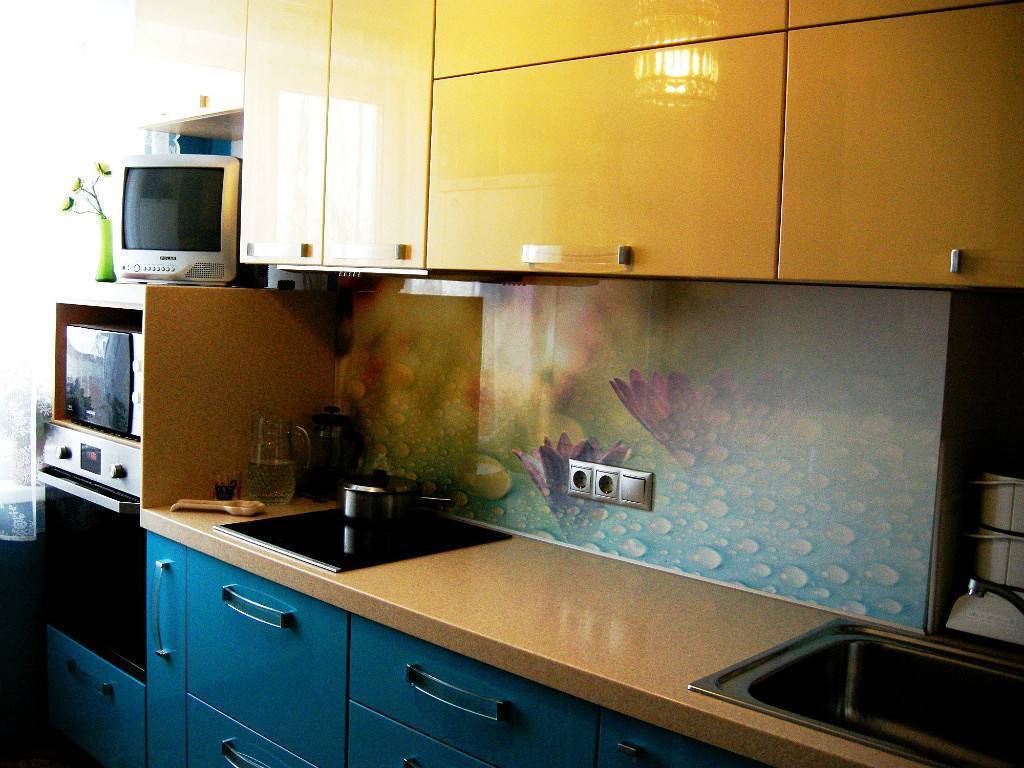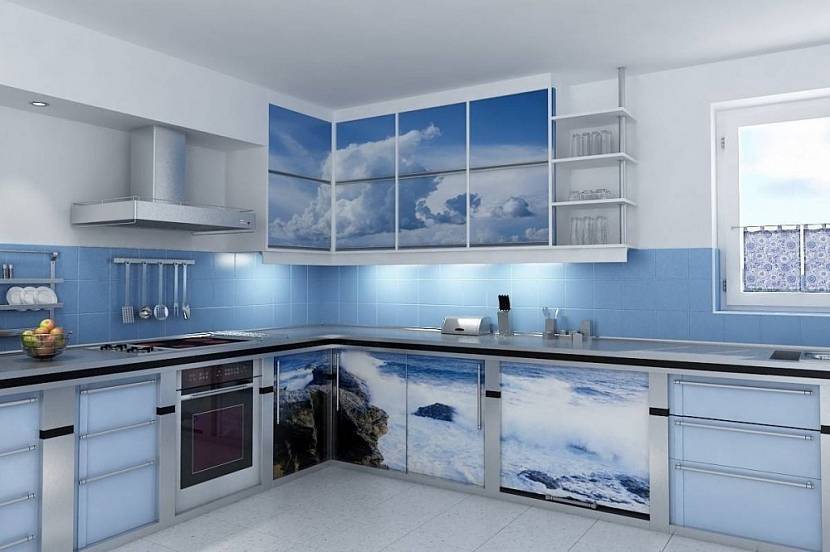 Отлично будет выглядеть мозаика, состоящая из керамических или стеклянных фрагментов в нескольких оттенках синего. Фартук синего цвета будет хорошо сочетаться с рабочей поверхностью белого, серого или черного цвета.