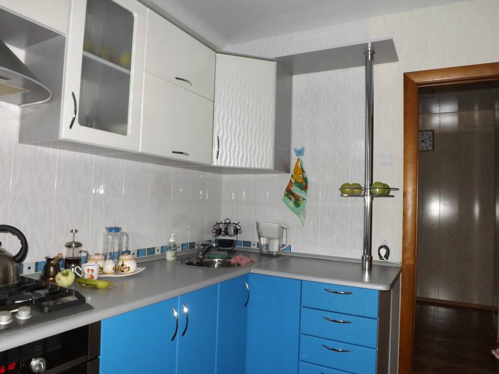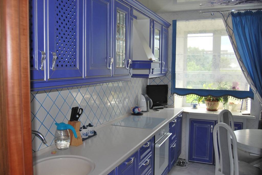 А можно не трогать гарнитур и оформить синим фартук. Не гонитесь за монотонностью и активно используйте декоративные элементы: так веселее и интереснее. Шторы подбирайте в тон тому оттенку, которого меньше в интерьере.