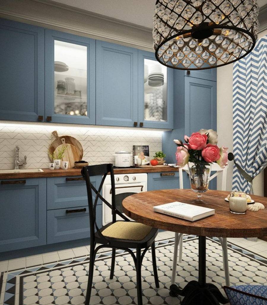 Важно правильно подобрать оттенок стен, пола, столешницы, текстиля.. Для маленькой кухни стоит использовать более светлые оттенки синего, а также применять цвет в ограниченном количестве.