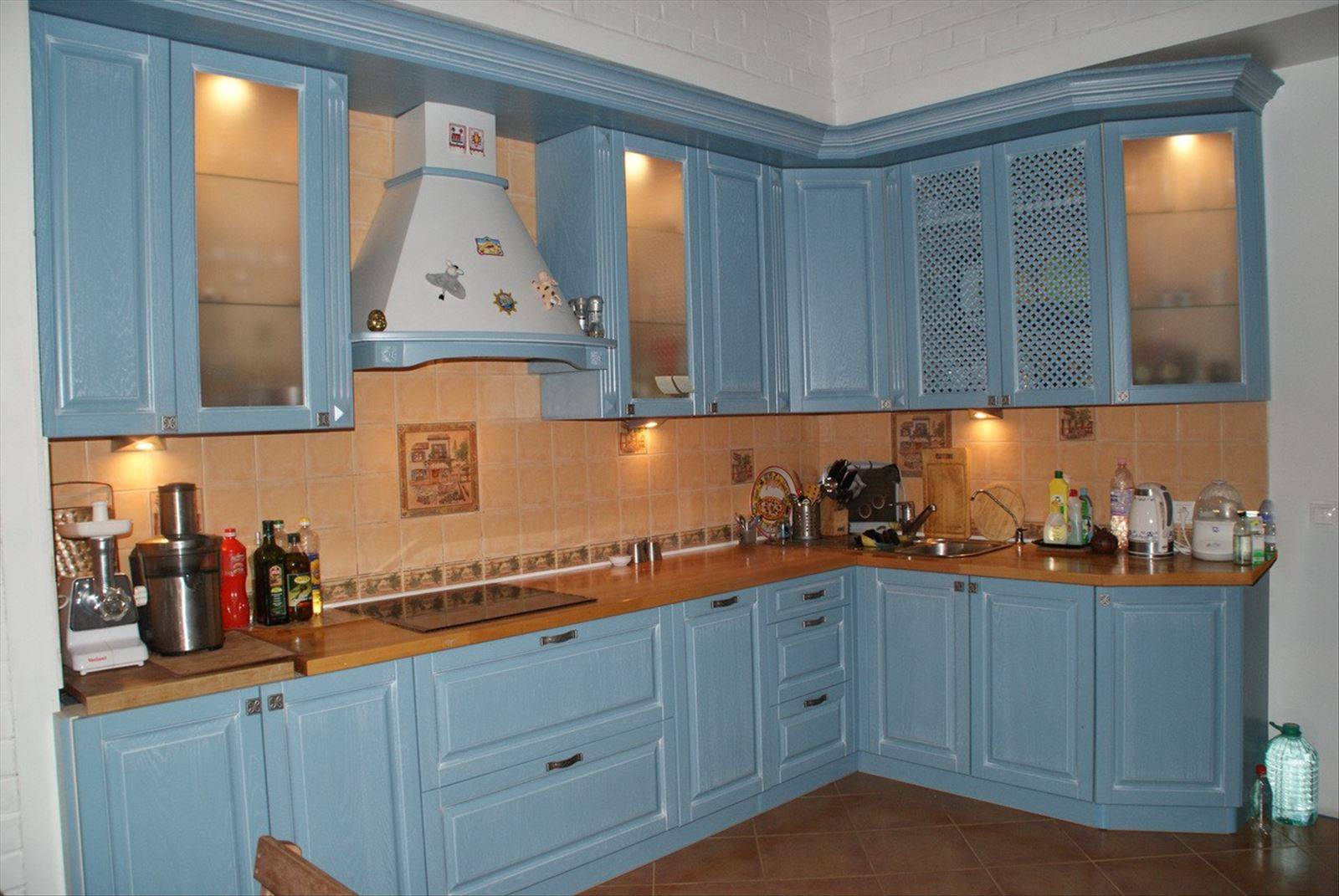 В классическом интерьере гарнитур синего цвета можно встретить нечасто. Применять подобный оттенок можно при обустройстве кухни в стиле кантри — однако он должен быть приглушенным и тусклым. В синем цвете можно выполнить столешницы, кухонный фартук и подобрать в тон шторы.
