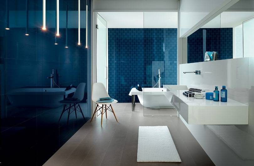Это отлично подходит для ванной комнаты, особенно оформленной в синем цвете – он хорошо сочетается со сталью и хромом, а глянцевые поверхности идеальны для влажных помещений.