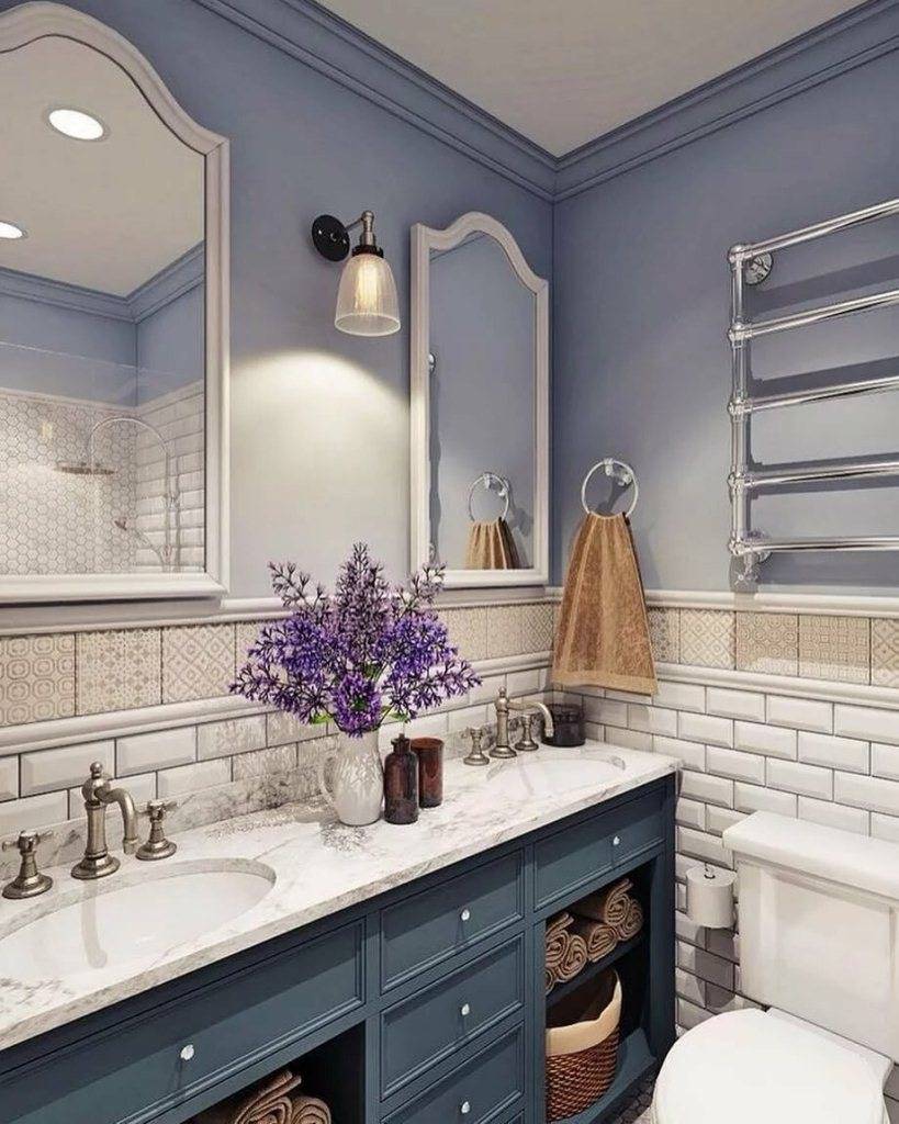 Можно использовать и стальной, например, для мебели и сантехники, либо для потолка и пола – он всегда смотрится стильно, отлично сочетается с синим и популярен в неоклассике.