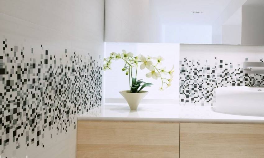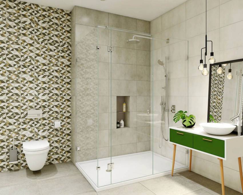 Сияние принесет в пространство белоснежная сантехника, зеркала и стеклянные элементы. Чтобы избавиться от монохромности, дизайнеры выбирают плитку разных оттенков, фактур, размеров.