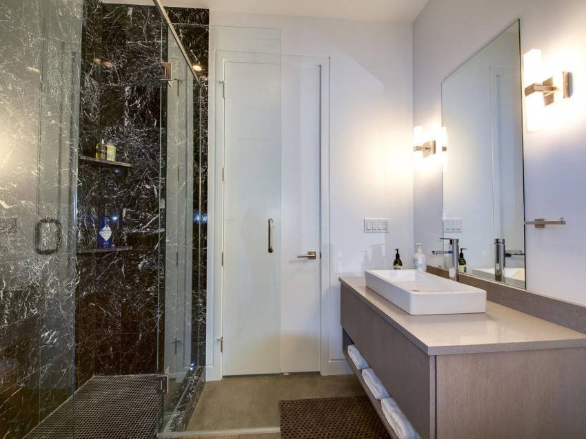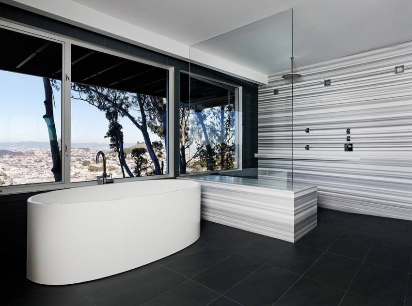 Кроме того, здесь требуется минимум декора, а главная изюминка заключается в нестандартных формах мебели и сантехники.