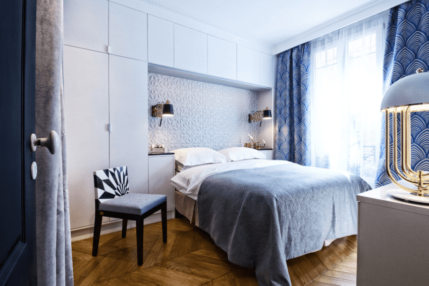 Различные фактуры и принты голубых оттенков в изысканной спальне
