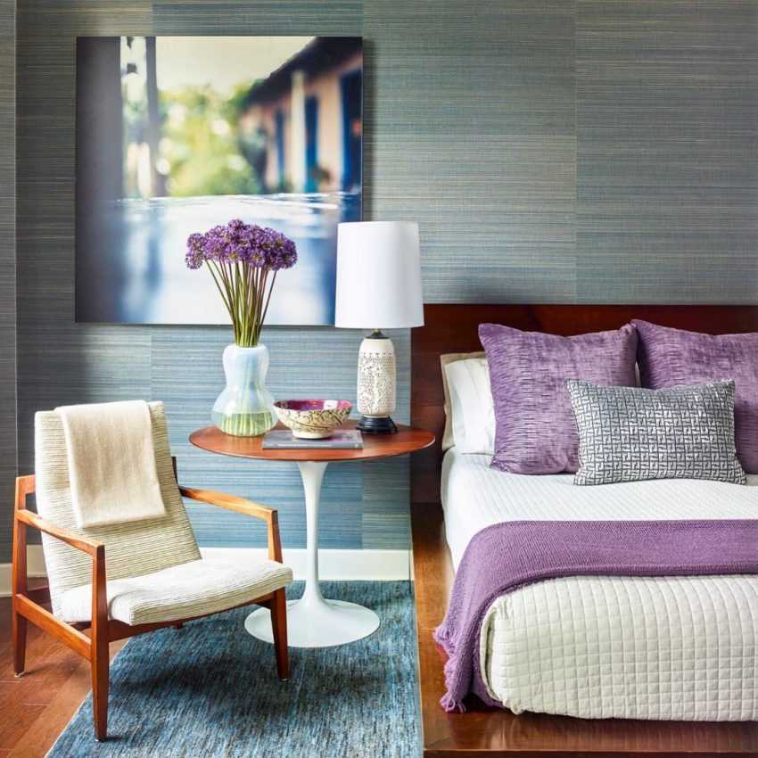 Например, сиреневый обои в спальне отлично сочетаются с бледно-желтым напольным покрытием. Данный оттенок относится к светлым тонам. Именно поэтому такое гармоничное соотношение красок способно создать ощущение уюта и тепла в зоне сна и отдыха.