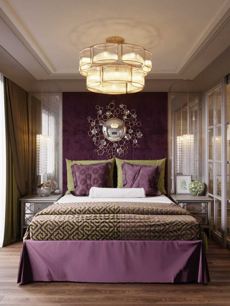 Спальня, выполненная в сиреневых тонах сочетать в себе несколько оттенков фиолетового. Многогранная палитра позволяет грамотно комбинировать нескольких цветов при этом не перегружая зону сна.