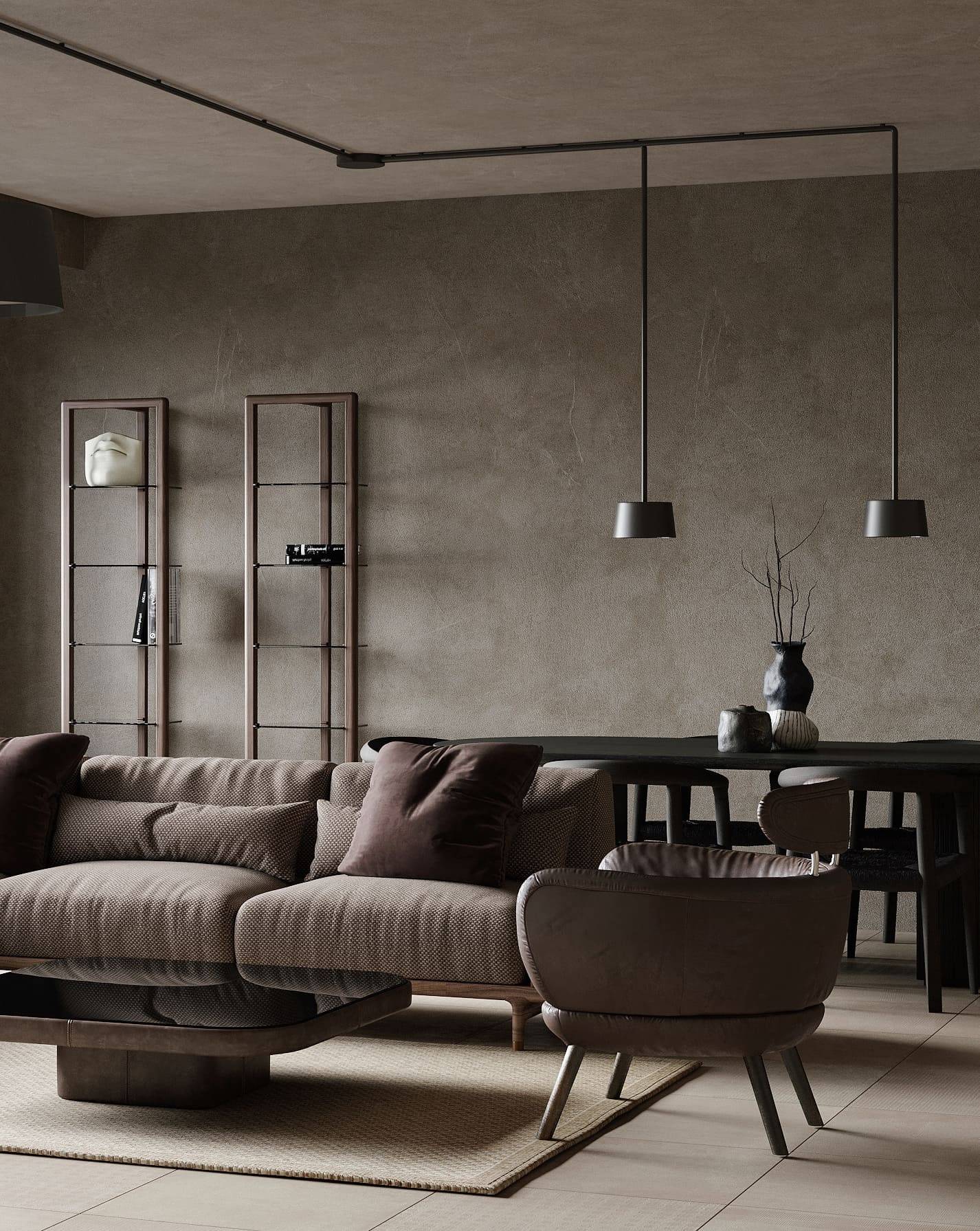 Коричневый диван очень хорошо дополняет интерьер комнаты