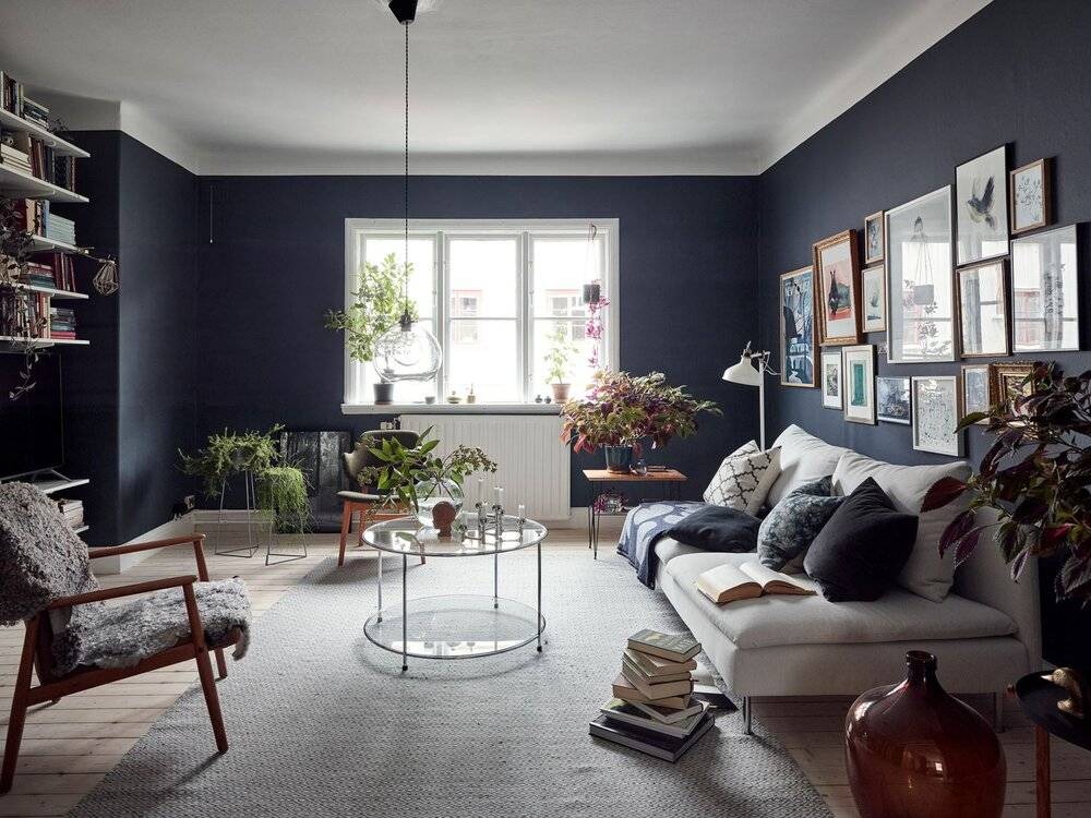 Если вы решили использовать в отделке стен глубокие синие оттенки, то делать это, как ни странно, следует в небольших помещениях. Границы визуально растворяются, словно в ночной дымке, и гостиная выглядит уютной.