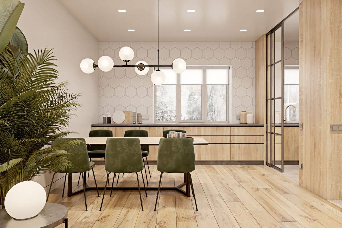 углом – столовый гарнитур и оформление зоны приема пищи, как на фото.