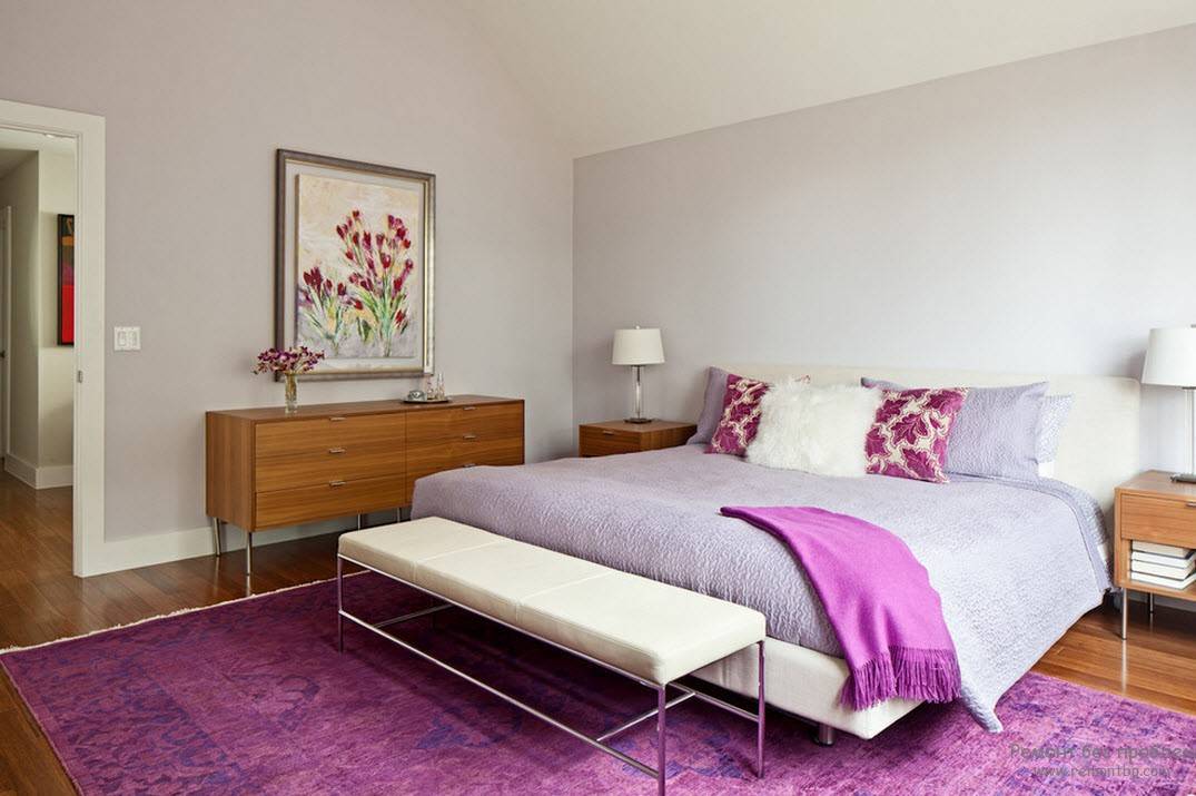 Сиреневый плед, покрывало или ковер добавят ярких красок в интерьер спальни, выдержанный в спокойных тонах.