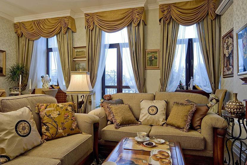 Например, для комнаты с хорошей высотой потолков и квадратурой не менее 30 м ограничений по выбору оформления практически не существует. А если вместо одного окна присутствуют несколько, то тогда наиболее удачным выбором может стать классика французской или английской направленности.